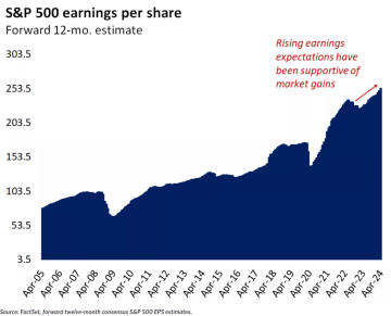 V nadcházejících dnech budou investoři sledovat dobíhající výsledkovou sezónu za 1Q ve Spojených státech, s kartami by mohl zamíchat i geopolitický vývoj zejména na Blízkém východě. Na trhy působí v současnosti více faktorů. Zatímco očekávané pomalejší snižování sazeb ze strany Fedu a související nárůst dluhopisových výnosů je negativní, příznivě naopak působí nárůst očekávání budoucích zisků firem, jak je patrné na grafu níže.