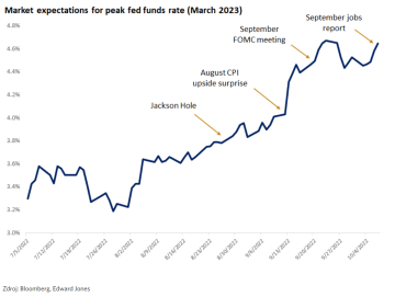 Graf: Vývoj tržních očekávání terminální sazby Fedu za poslední tři měsíce. Lze vidět, že se sazba může vyšplhat až na 4,6 %.