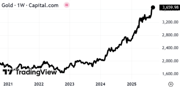 Pokračující globální nejistota v kombinaci s oslabujícím dolarem a nákupy ze strany centrálních bank svědčí zlatu. To vystoupalo až k úrovním 3 650 USD za unci (viz graf níže), za poslední 3 roky tak připsalo zhodnocení na úrovni 120 %. Jde o jedno z aktiv, kam investoři přelévají část kapitálu v návaznosti na částečný odtok prostředků ze Spojených států. Mimo jiné tím reagují i na pokračující enormní deficity vlády USA pohybující se v rozmezí 6-7 % HDP.