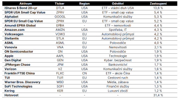 Největší pozicí nadále zůstávají dlouhodobé státní dluhopisy USA prostřednictvím iShares $ Bond 20+yr, které výrazným způsobem přispívají ke stabilizaci hodnoty majetku fondu. Dodávají tak nejen potřebnou diverzifikaci a atraktivní kupónové výnosy, ale i potenciál nárůstu ceny do příštích let v návaznosti na uvolňování měnových podmínek.