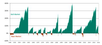 Poklesy tak mohou být velmi zajímavou příležitostí k nákupu pro dlouhodobě orientované investory. Jak je patrné na grafu níže, medvědí trhy trvají zpravidla krátkou dobu (v průměru 15 měsíců) a jsou zpravidla následovány silnými dlouhotrvajícími růsty. Bylo by tak chybou z akcií vystupovat, když chytří investoři právě nyní postupně budují pozice v rámci svých akciových portfolií.