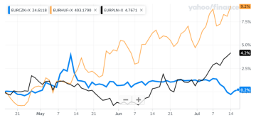 Graf: Zatímco koruna vůči euru stagnuje, zlotý a forint znatelně ztrácí, zdroj: finance.yahoo.com
