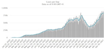 Graf týdne: Denní případy nově nakažených covid-19 ve světě, zdroj: worldometers.info