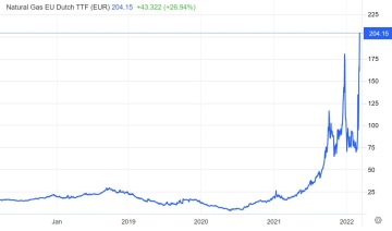 Graf týdne: extrémní vývoj ceny plynu v EU, zdroj: tradingeconomics.com