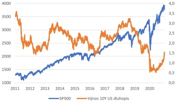 Úroveň tržních úrokových sazeb je však z historické perspektivy stále nízká, když v posledních 20 letech dosahoval průměrný výnos 10letého státního dluhopisu USA 3,1 %, nyní je to prakticky polovina. Ačkoliv se můžeme dočkat dalšího růstu výnosů, měnová politika Fedu zůstává nadále velmi uvolněná, což podporuje současné ceny akcií a dalších rizikových aktiv. Hlavní představitel americké centrální banky Powell však v týdnu svým komentářem zklamal, když nenaznačil, že by v případě rychle rostoucích výnosů mohl Fed zasáhnout.