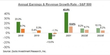 Graf týdne: Meziroční změna zisků (zeleně) a tržeb (oranžově) v rámci firem z indexu S&P 500, včetně predikce