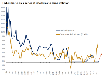 Významnou událostí bezesporu bylo zasedání Fedu, v jehož rámci americká centrální banka navýšila základní sazbu o 0,25 procentního bodu na 0,25-0,5 %, jde o první „hike“ od roku 2018 a zároveň první krok k normalizaci měnové politiky. Důvod je jasný, a to bezmála 8% inflace pohybující se na 40letých maximech. Fed tak už nepovažuje současné cenové růsty za přechodné, neboť začíná mít obavy z možného zakořenění vysoké inflace v ekonomice.