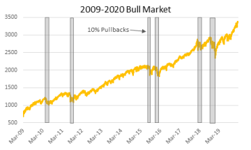 Graf týdne: Vývoj indexu S&P 500 v letech 2009-2020, více než 10% korekce zvýrazněny šedě, zdroj: edwardjones.com