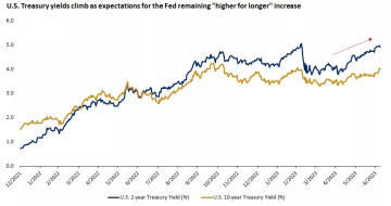 Investoři tak nyní očekávají, že Fed na svém příštím zasedání 26.7. přistoupí k navýšení sazeb do pásma 5,25-5,5 %, přičemž nelze vyloučit ani další navýšení v průběhu podzimu. První snížení sazeb je pak pravděpodobné až na jaře příštího roku. Na posun očekávání směrem k vyšším sazbám po delší dobu reagovaly výnosy státních dluhopisů růsty, když dvouletý dluh USA nese aktuálně výnos okolo 5 %, přičemž 10letý se pohybuje na 4% úrovni.